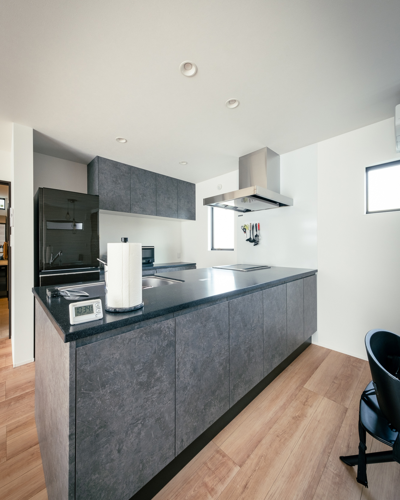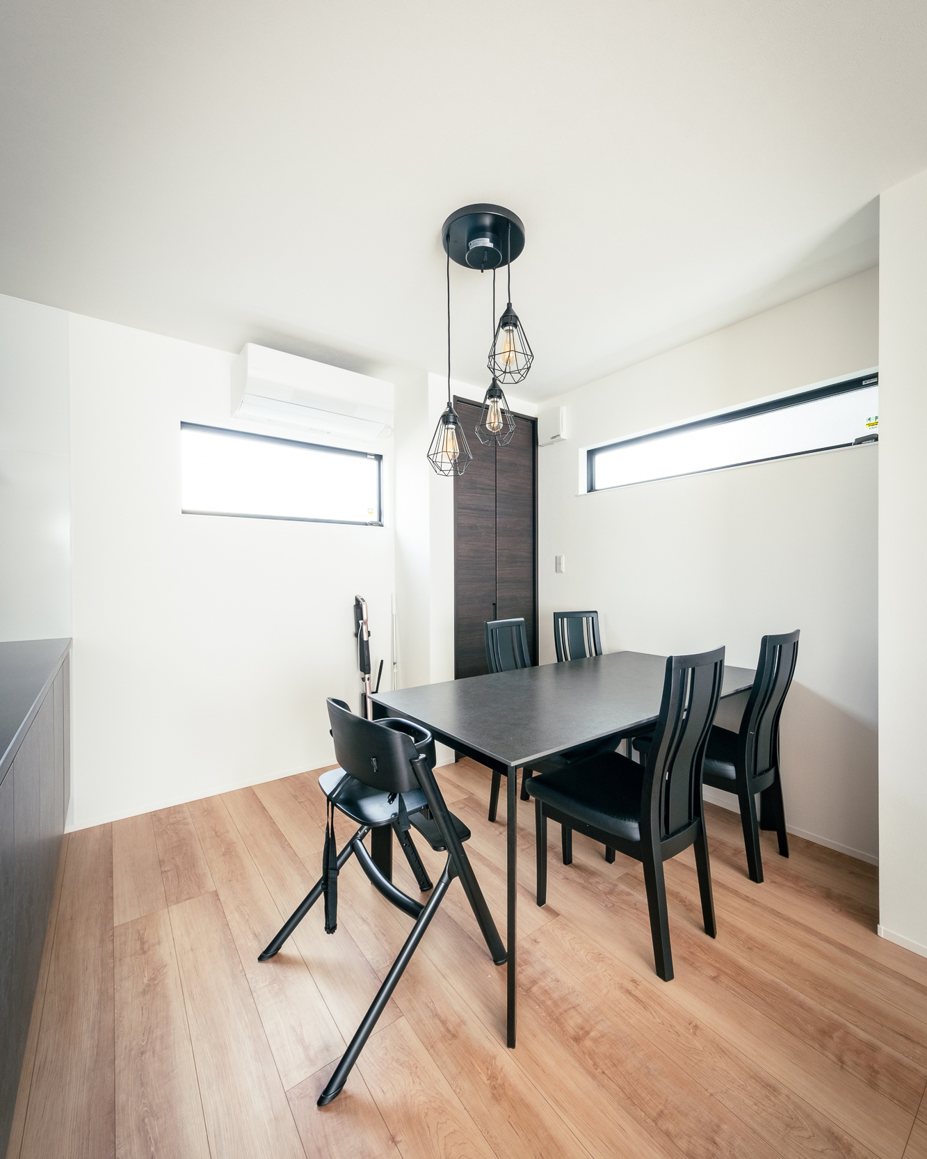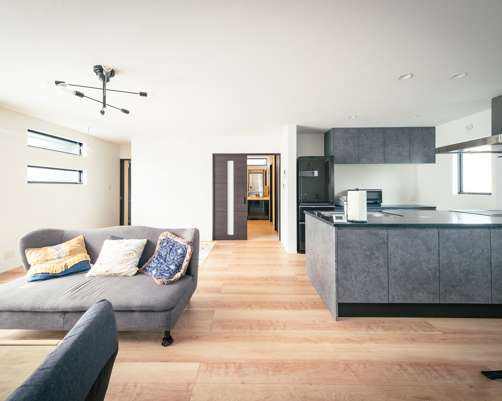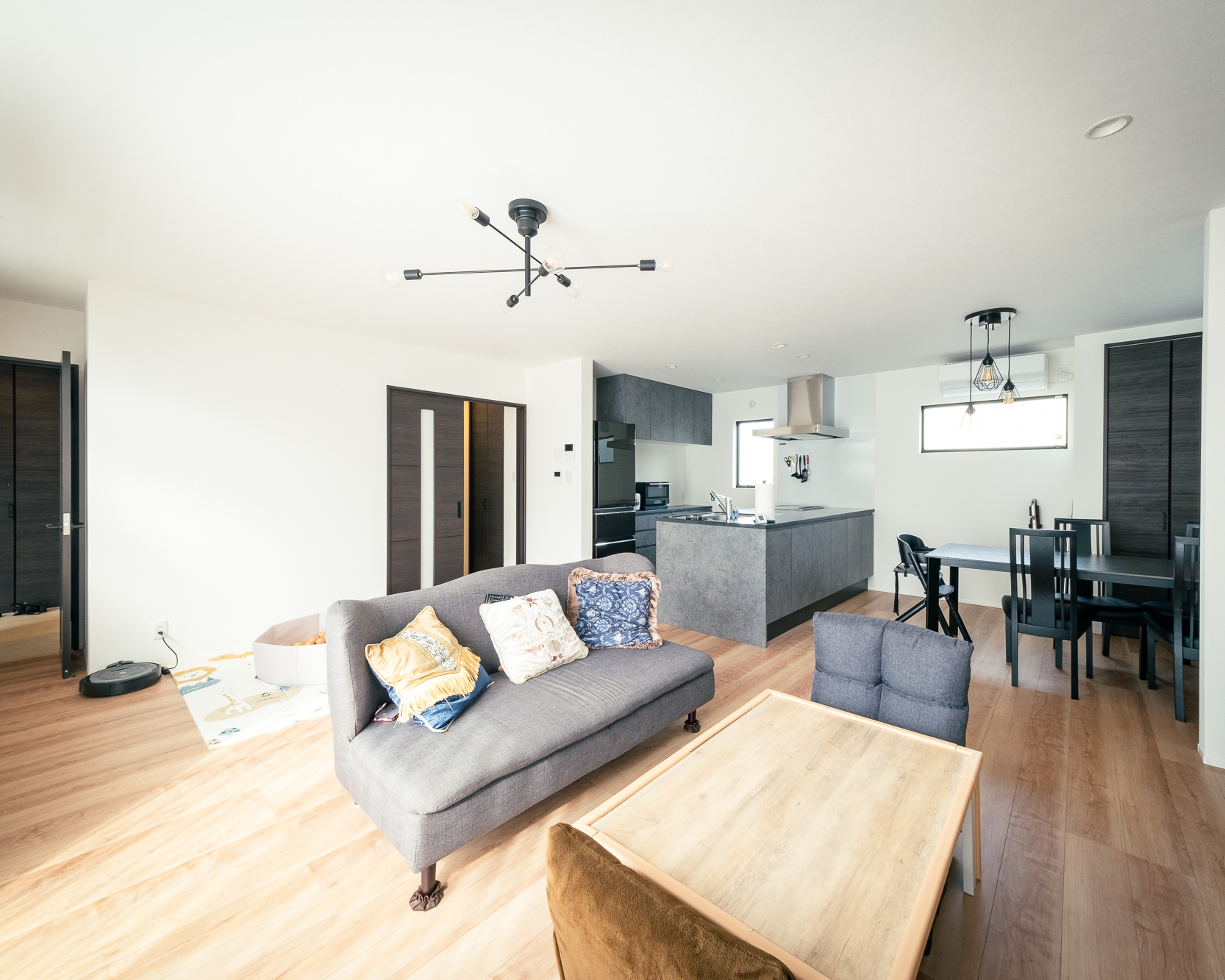 家づくりの要望は、収納スペースを多く確保したいこと。リビングをとにかく広くしたいこと。そして、ご主人様の筋トレルームを作ること。と明確なニーズにまとめられていたので家づくりもスムーズに進んだそうです。特に、K様邸宅のLDKは23帖にも広げられ、開放感が桁外れ。どこからでも家族の気配を感じ取れる綺麗な配置に、空間的余裕がたっぷりあるのでどこにいても居心地の良いLDKになりました。また、クロスなど全体のコーディネートは各メーカーのショールームを回って実際の商品をきちんと見て決めてたそうで、全体の統一感もお見事。採光窓もキッチン・リビング・ダイニングそれぞれにきちんと設けられ、日中はどこにいても日差しを感じられるようになりました。