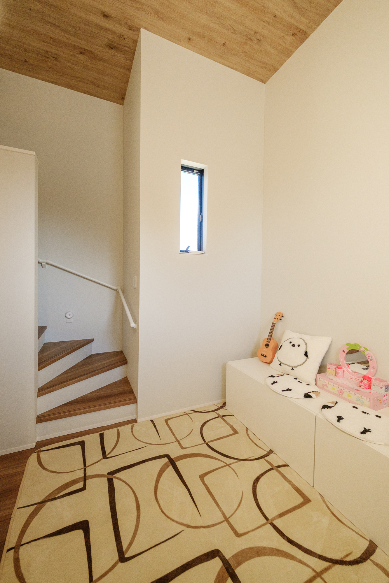 1階と2階の間にメザニン(中2階)をプランニングされたA様邸。ここはキッズスペースとして活用されています。1階リビングからもキッズスペースの様子が見れるように、TV背面壁の一部をFIX窓に。また2階主寝室からも見守れる仕様になっています。採光窓をきちんと確保され、日中は日差しが差し込み明るい空間に。空調設備も完備され、いつまでも遊びたくなるキッズスペースに仕上がりました。