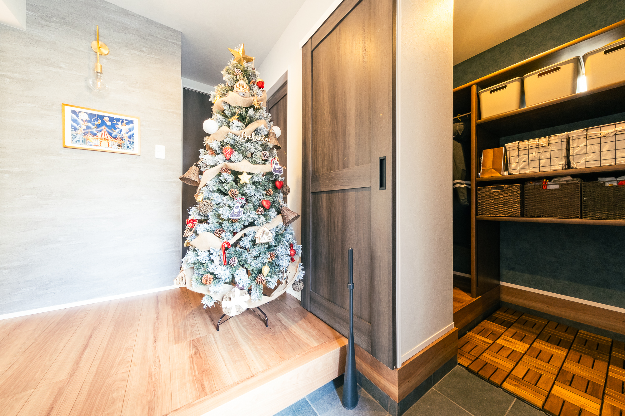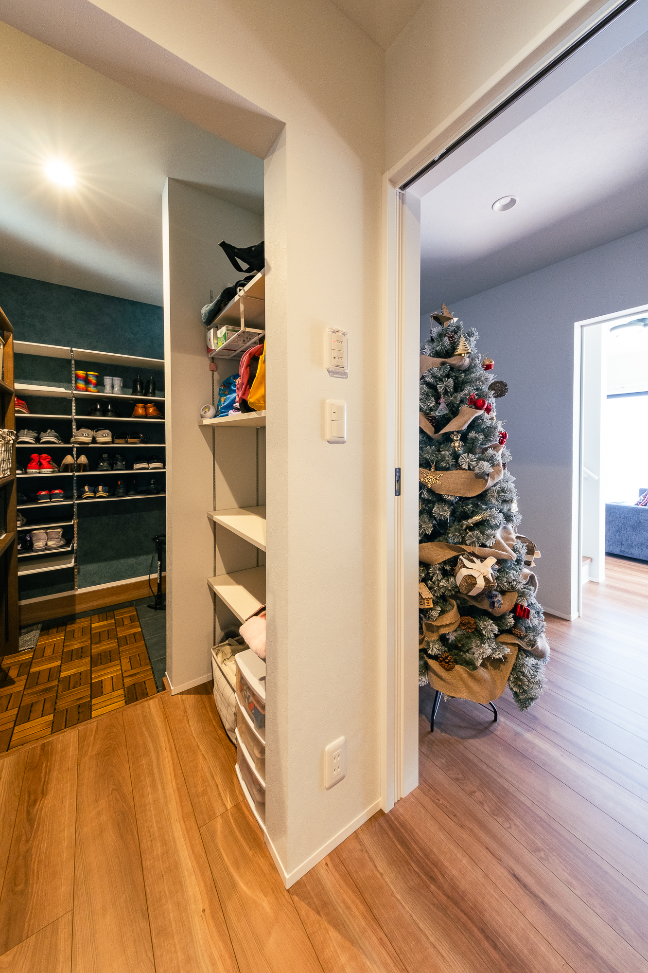 シューズクロークだけでなく、外出時にサッと持ち出したい物や、上着などもこの帰宅動線上に配置。