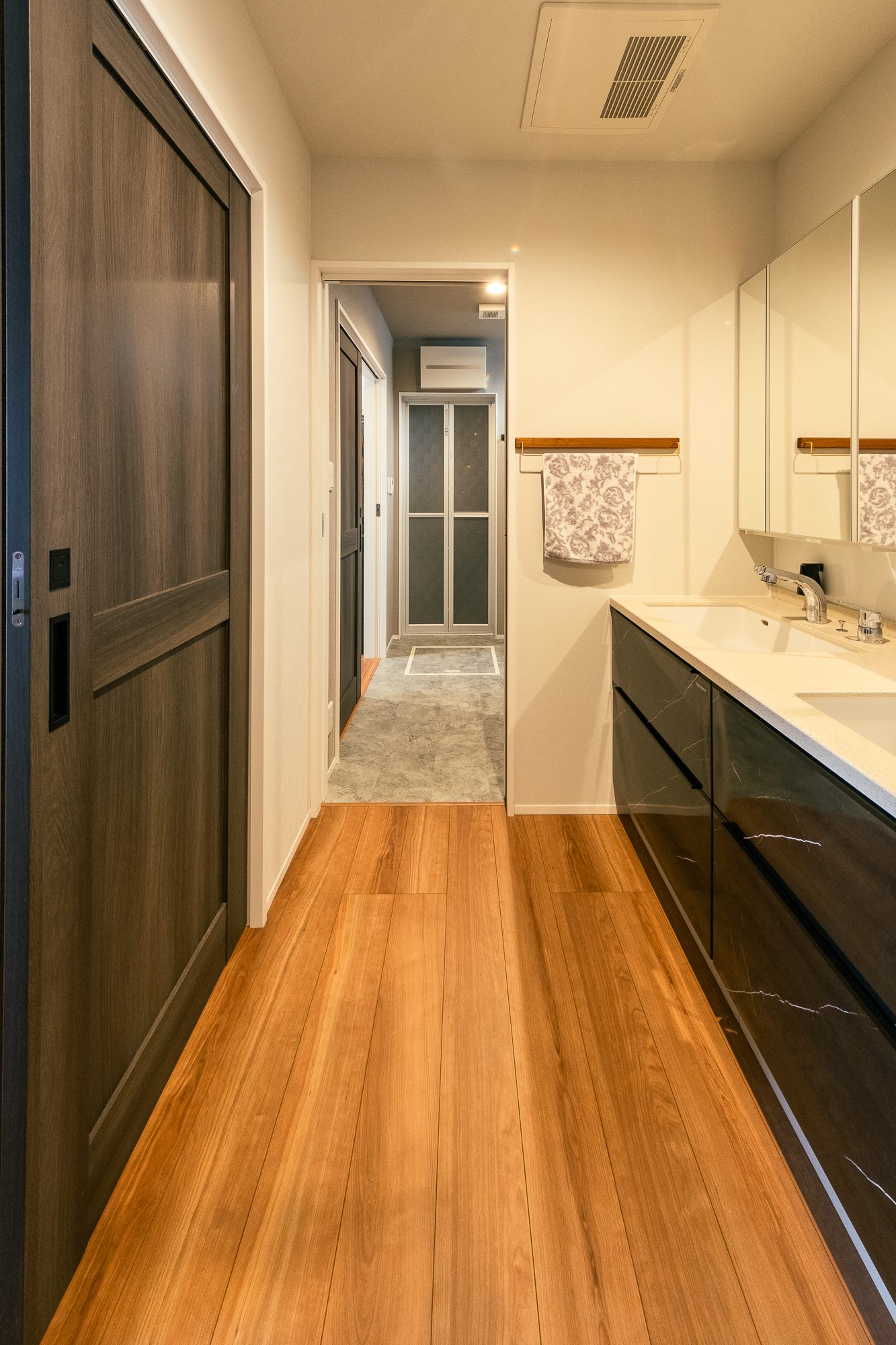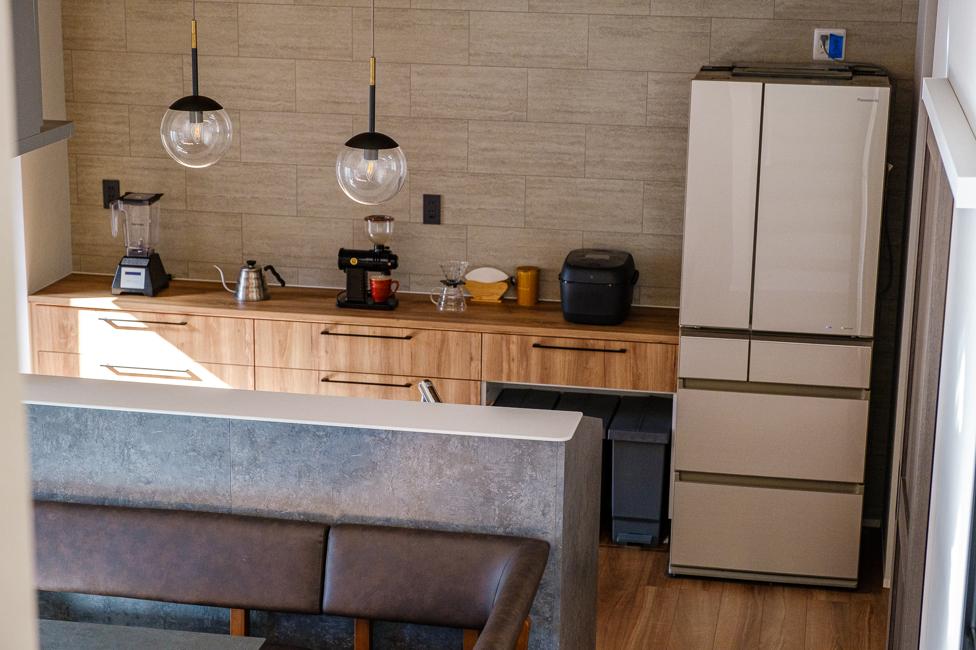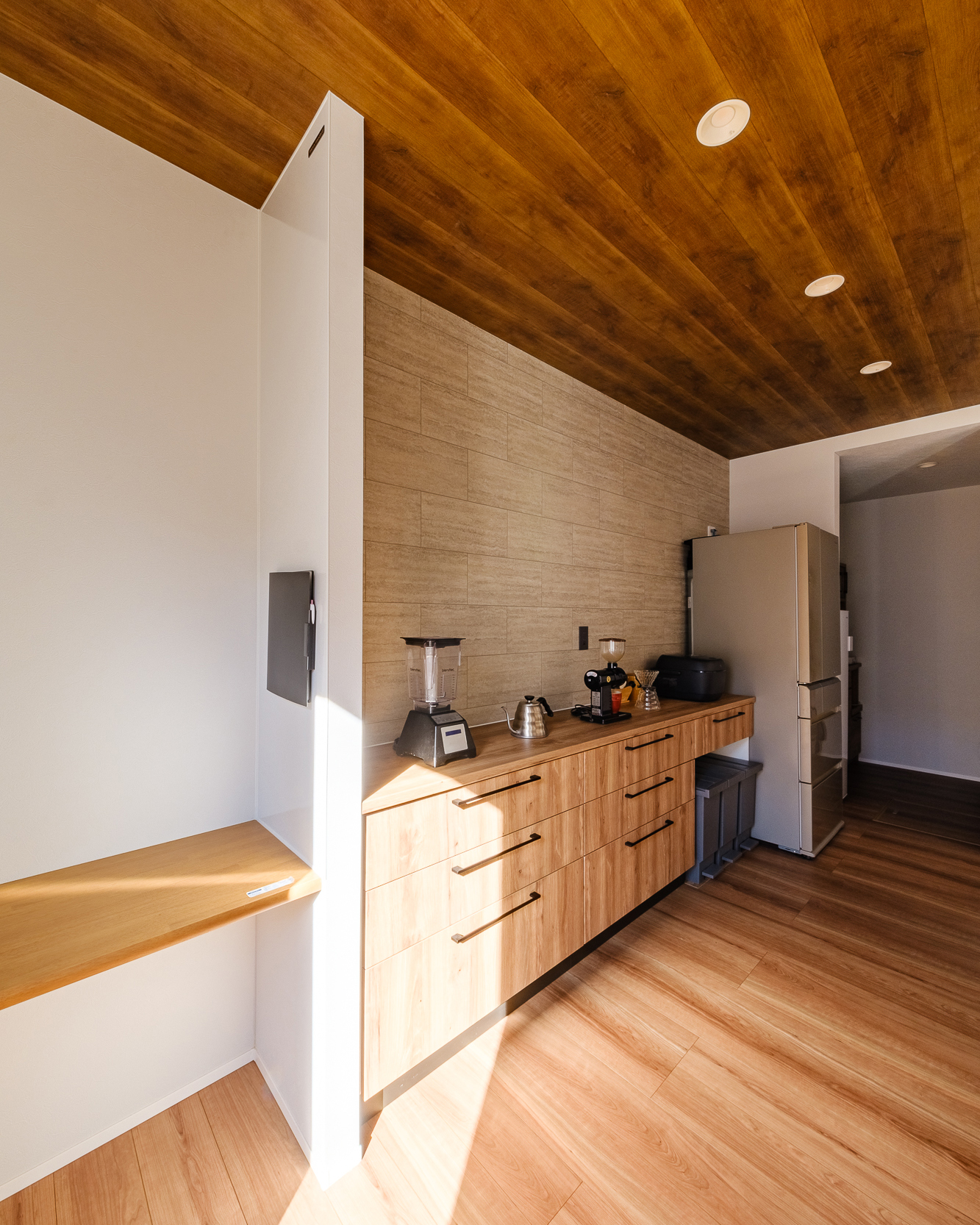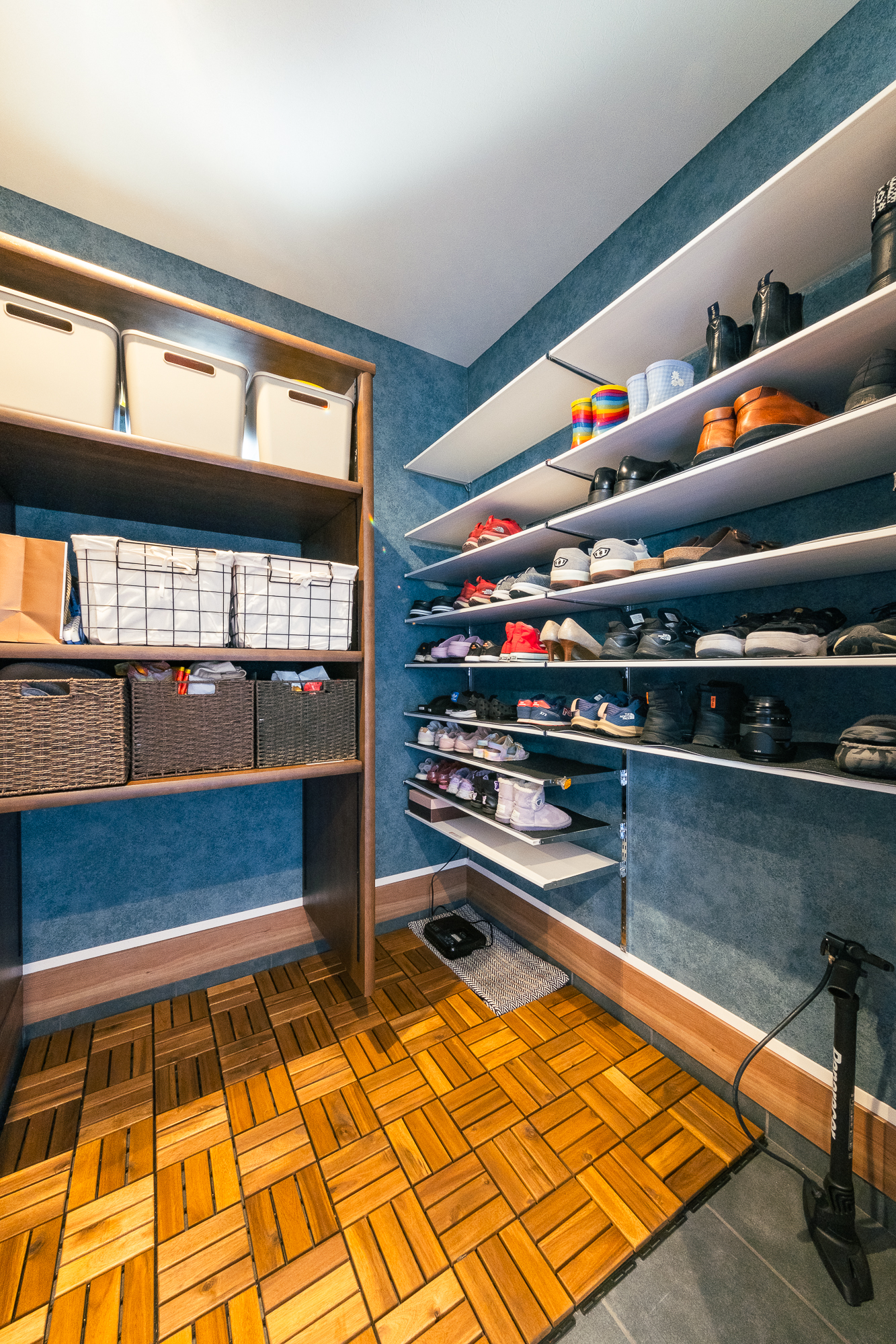 A様邸の魅力は、特別な想いと毎日の利便性を両立させたことでした。玄関横の引き戸を開けるともう一つの帰宅動線が。ここには、シューズクロークだけでなく、外出時にサッと持ち出したい物や、上着などもこの帰宅動線上に配置。生活のリズムを回遊動線上にきちんとプランニングされました。手洗い動線や、そこから続くファミリークロークの配置などはさすが。冷蔵庫からつながるパントリーには、食料品だけでなく、もう1つの冷蔵庫も設置することができる仕様です。