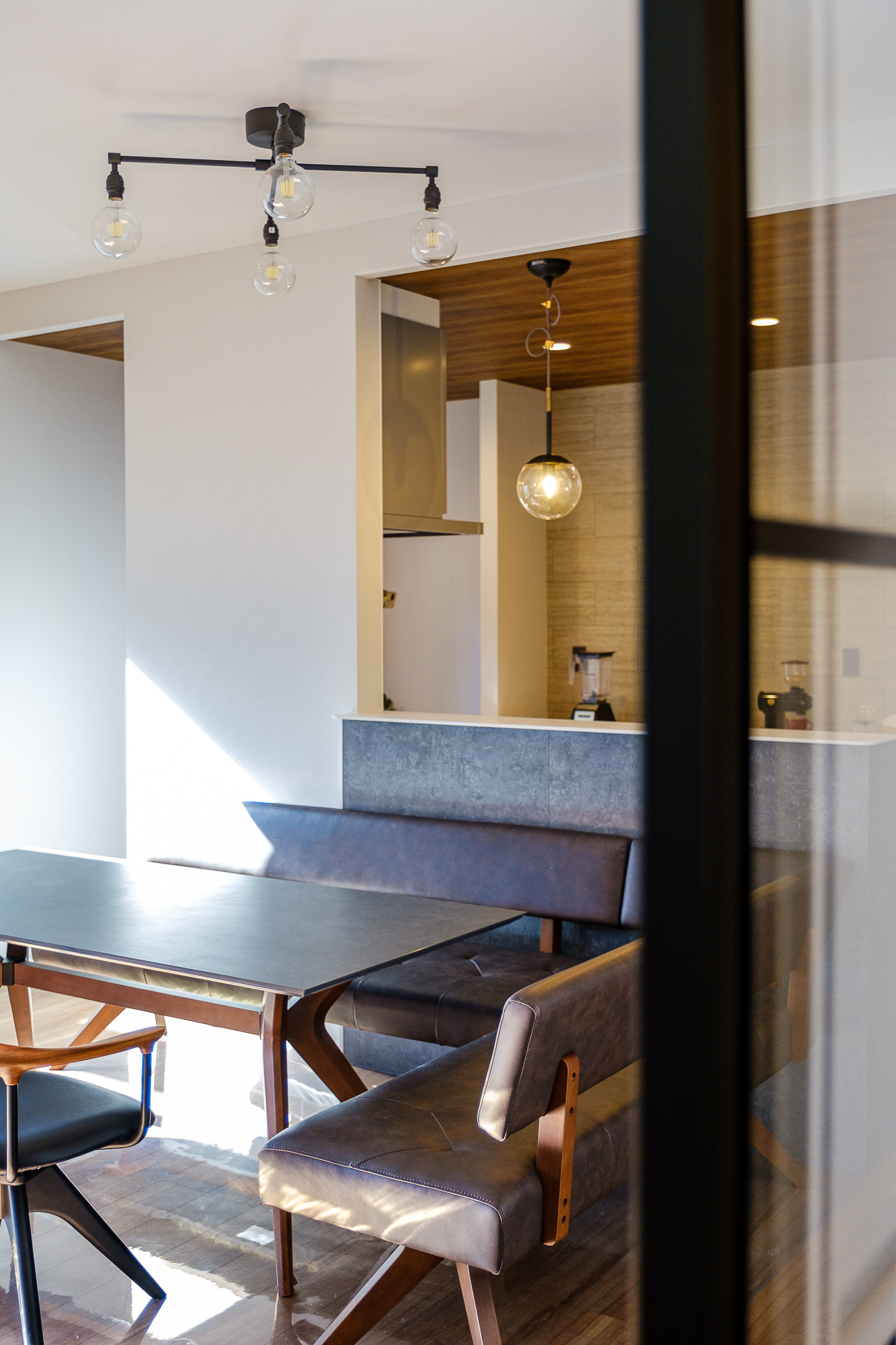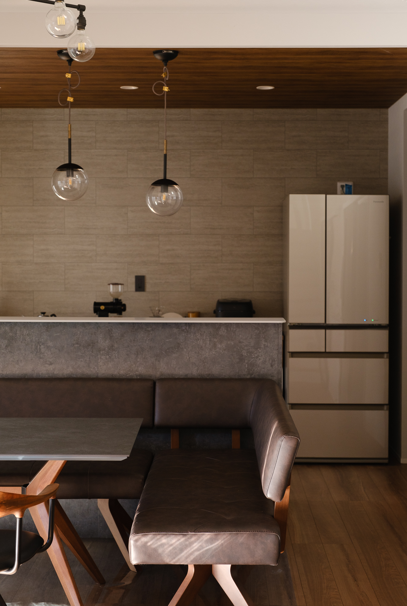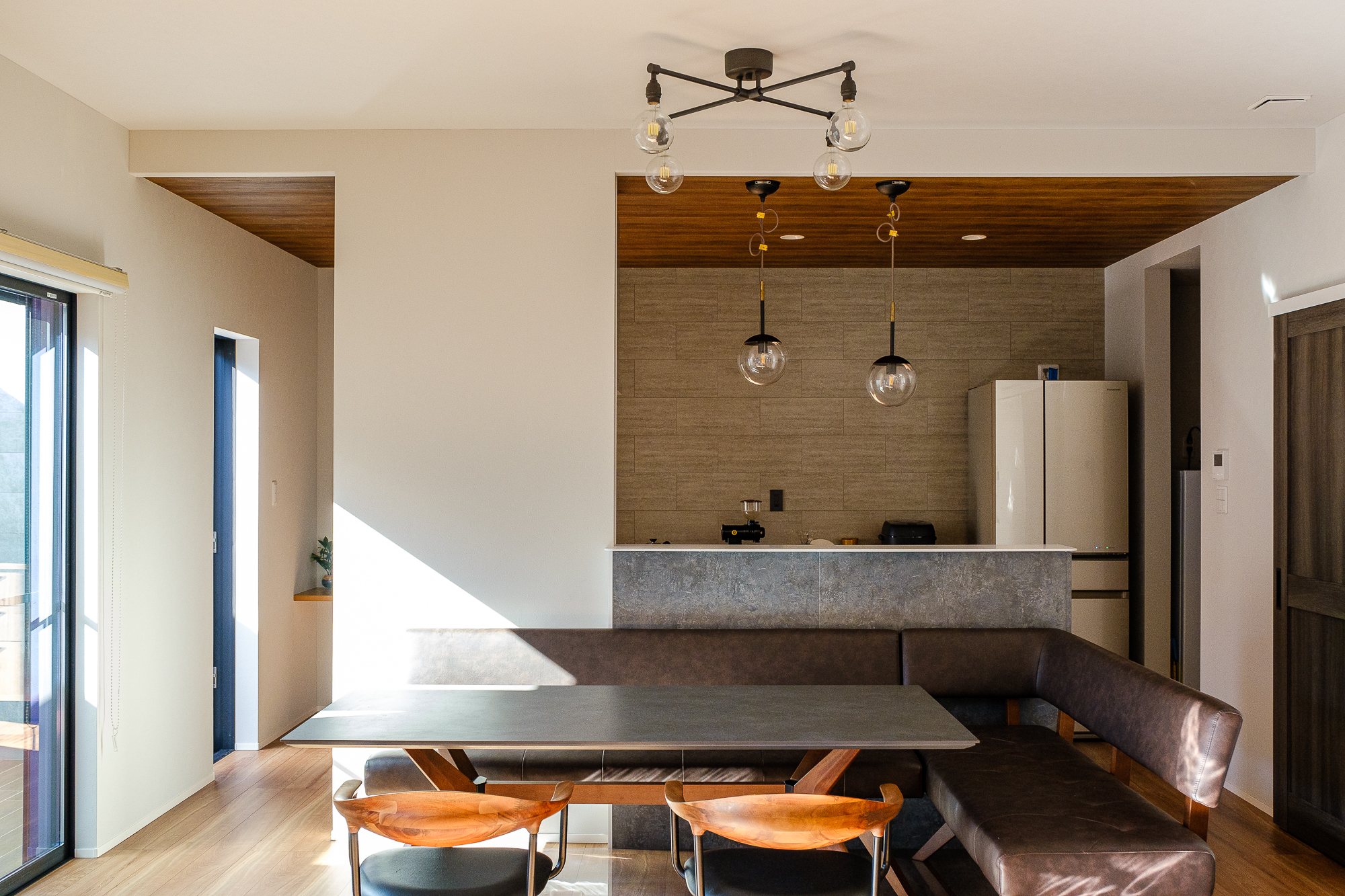 子ども達を囲んでコミュニケーションしやすいL字のソファダイニング。