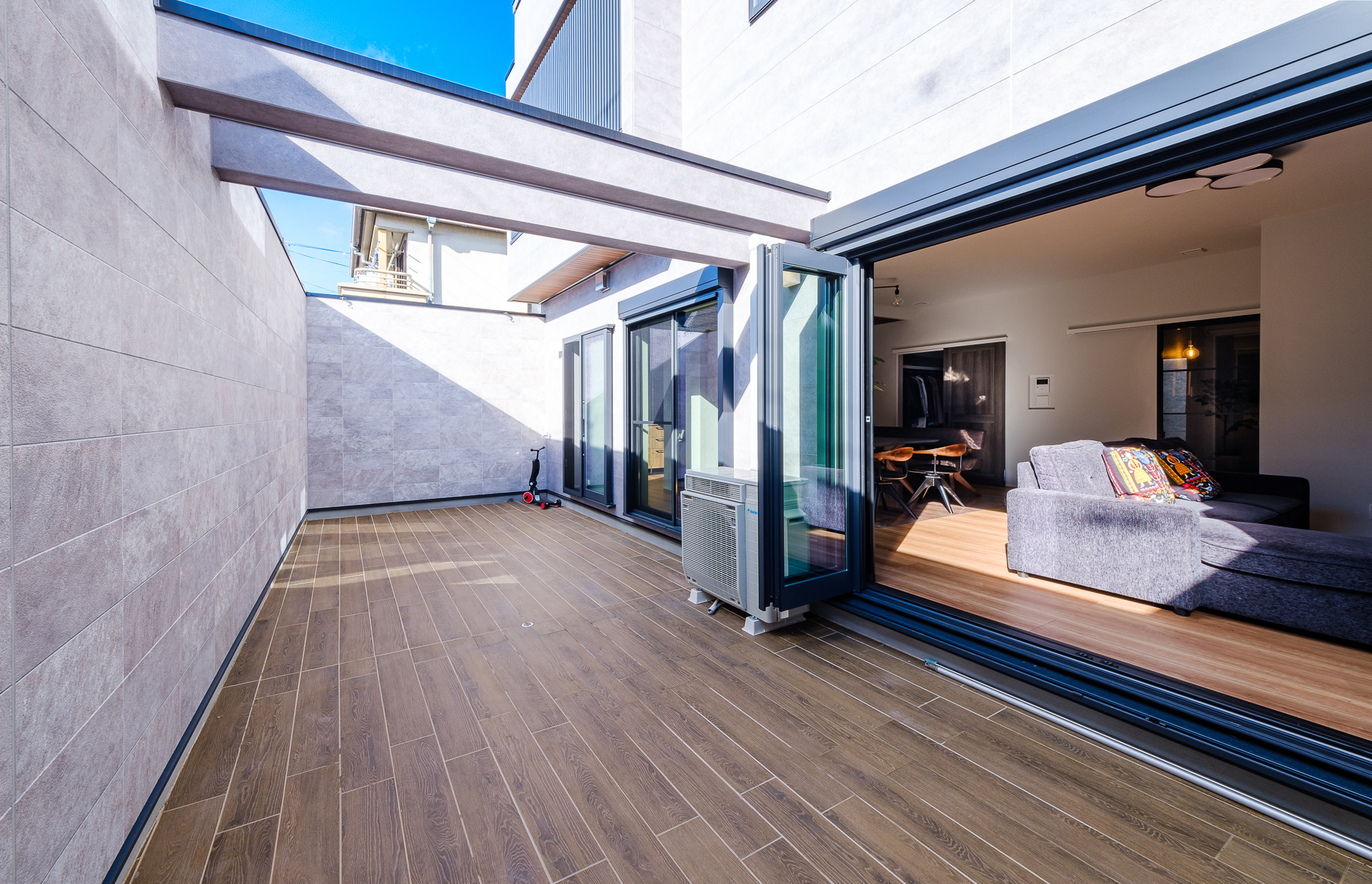 燦々と日差しが降り注ぐロジアからLDKの美しい繋がり。全開放を実現する折戸タイプのテラス戸を採用。